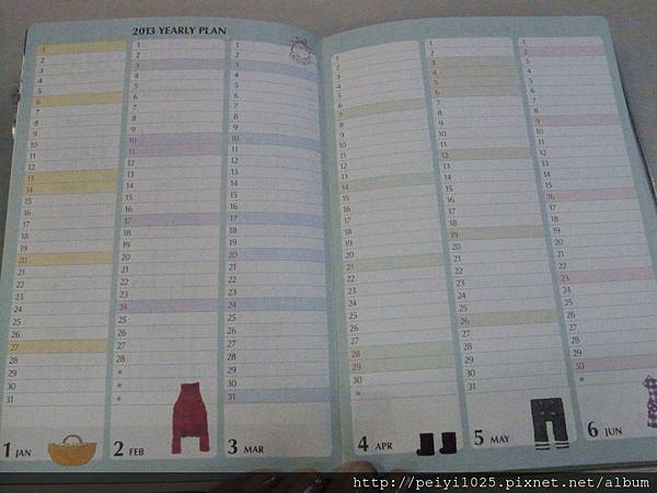 (上)2013 將年度計畫分成兩頁,格子比較長下面也比較多可愛的插圖