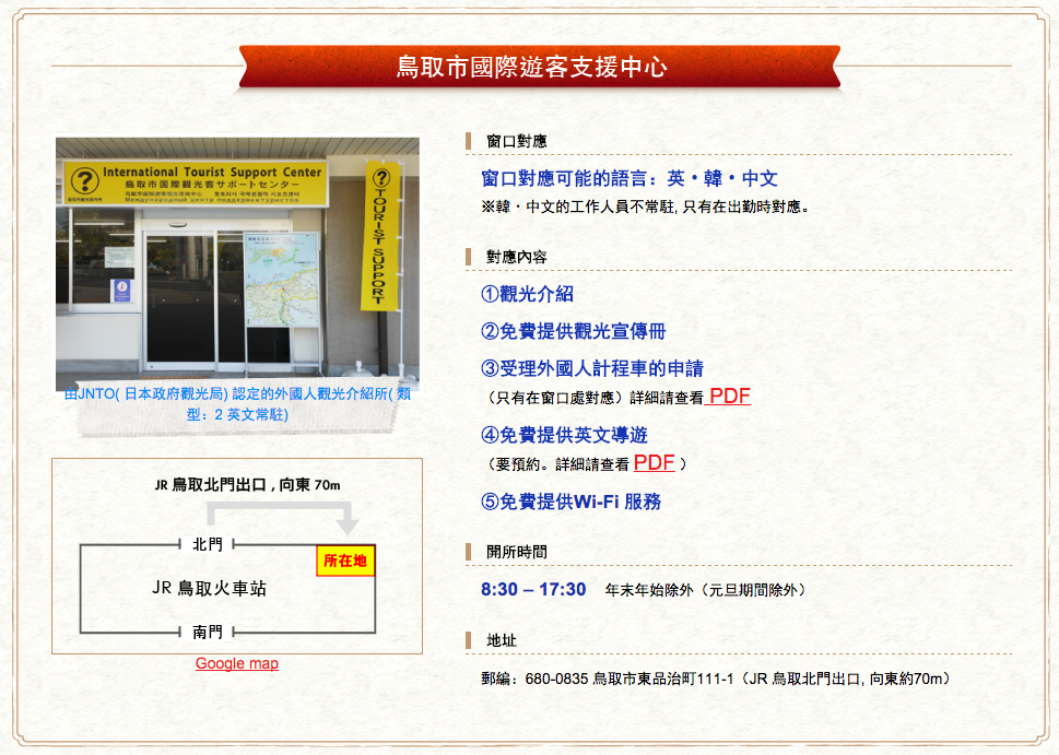 要使用千元計程車只要到JR鳥取站的觀光案內所申請即可,但要注意的是,站內的觀光案內所主要是以日文溝通為主,在北口側的國際觀光案內所則有可以用英文及中文溝通的工作人員,但官網有備註,中文服務人員並非長駐,英文則是隨時都能提供服務。